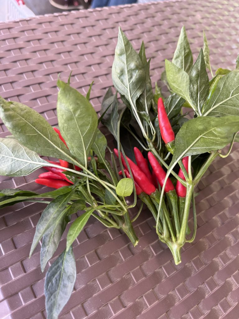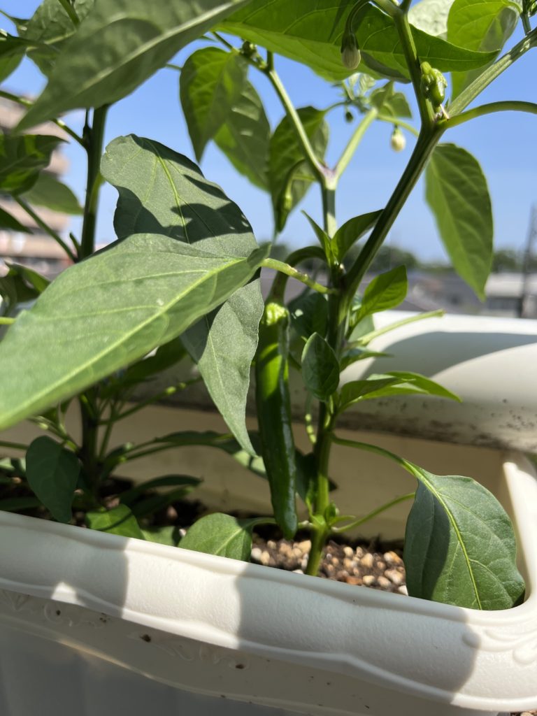 20240708 ようやく猛暑の真夏日がやってまいりました。さて、ししとう・唐辛子の生育ですが、とても順調に成長しております。1本赤く熟し初めこれから真夏日のカンカン照りによる辛さ倍増計画に入るかと存じます。唐辛子の辛味には心臓に良いと昔から言われており、カプサイシンたっぷりの激辛で猛暑を乗り切りましょうよ。非常に手間のかかる植物ですがとても繊細な幼少期の唐辛子。辛くなーれ!