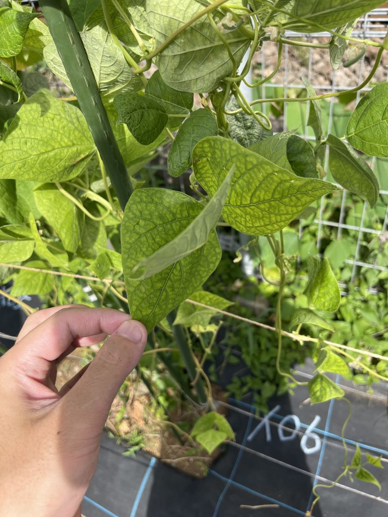 20240729 葉の模様の写真を見て頂けるとお判りいただけますが、人間でいるところの血管(毛細血管?)のような模様が目立つインゲン。今年は病気かもしれません。実の付き方もとても小さく、種子をまた冬に成長させて越冬させた状態から身の付き方を見てみたいと思います。本当に残念です。今のところ、収穫本数、3本。