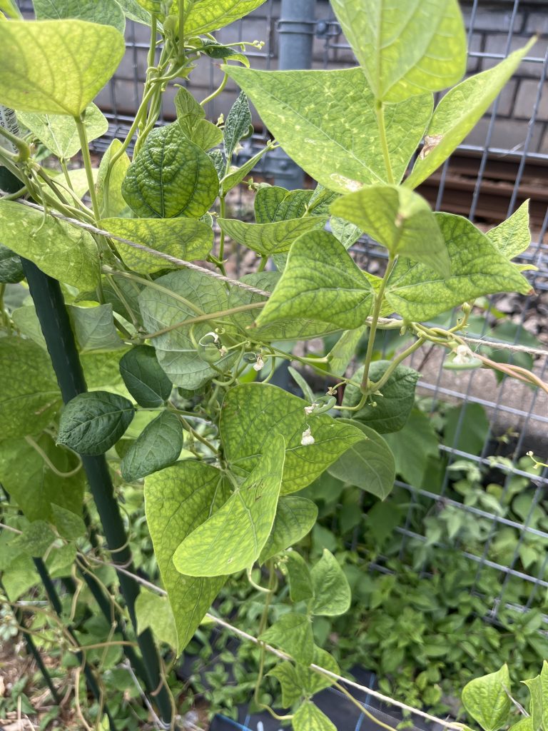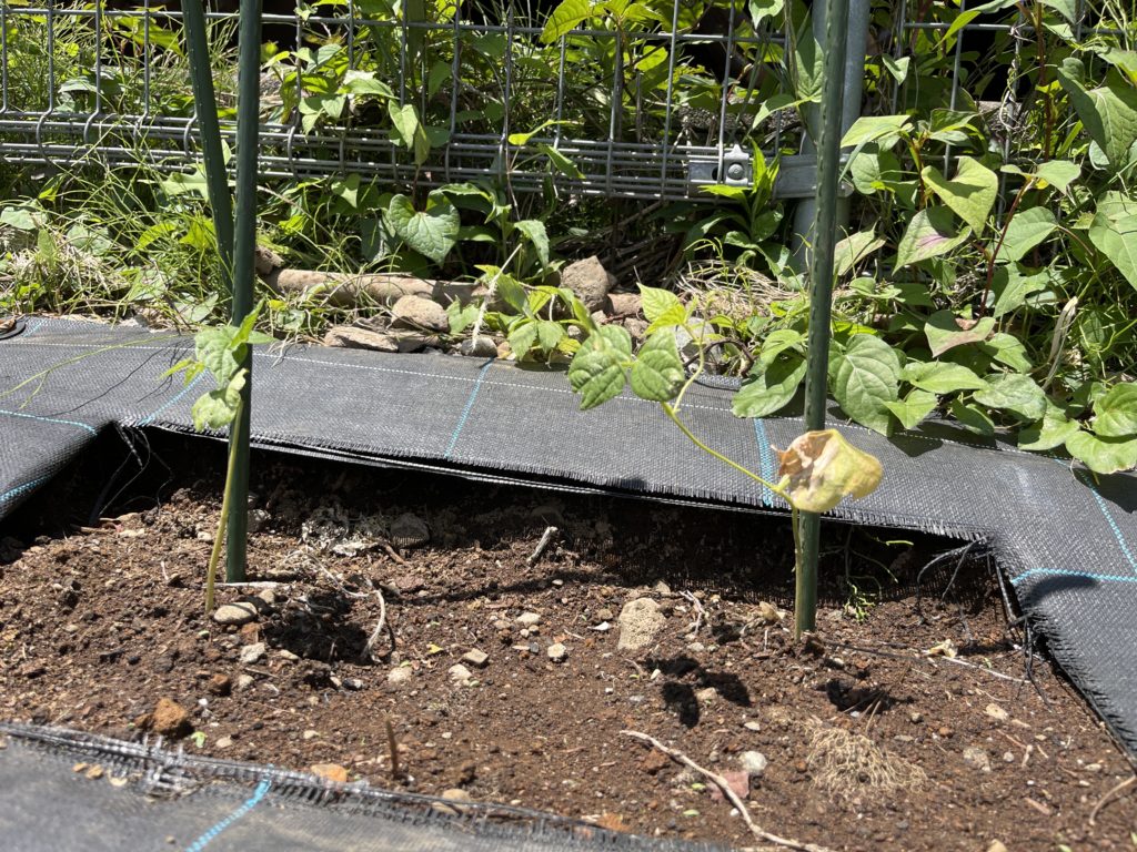 20240724 つるまきいんげん、もろっこいんげんですがこの暑い夏で植物も夏バテしているのでしょうか?非常に少ないいんげんの実を食べる機会を奪ってしまうので、これからもめげずに行って生きないと思います。いんげん農家さん、尊敬です!