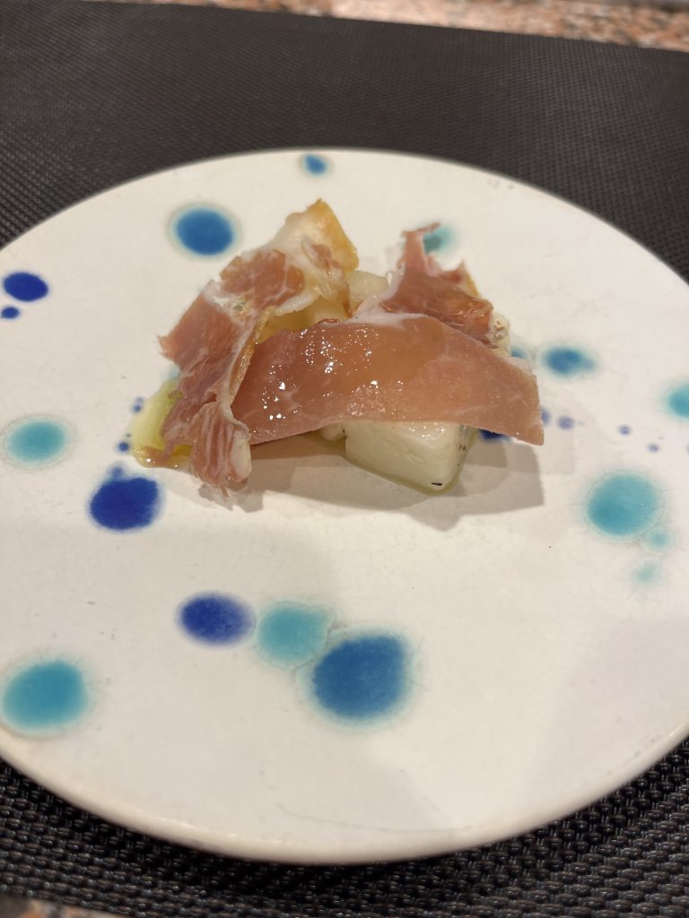 20241010 田園調布倶楽部の鉄板焼き田焼様;シェフに真桑瓜をお渡ししたところ、とても快く、引き受けてくれました。ありがとうございます。ところで生ハムメロンのような感覚で食べられるとは思ってもみませんでした。