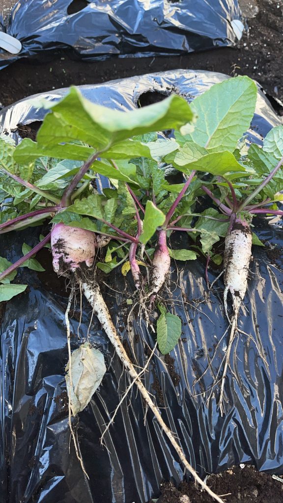20250109 紅三太大根の収穫、出荷いたしました。昨年から残りのお野菜は「ソラマメ」「ロマネスコ(できるかどうかわからないけど)」、「芽キャベツ」、「絹さやえんどう」。「モロッコインゲン」。特に冬野菜の厳寒期は全く成長がしませんので、辛抱と、根気で乗り切ります。