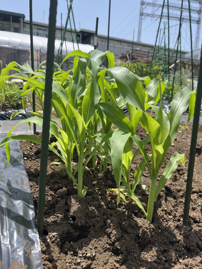 20250520 ハニーバンダムトウモロコシ、今年のメイン商品です。今非常に暖かくなる真夏への上昇気温の傾向にある為、成長著しいといった感じでしょうか?ライバルの別品種;ゴールドラッシュ方法よりは成長が遅滞していますが、根本が元気なためこれからといった感じです。